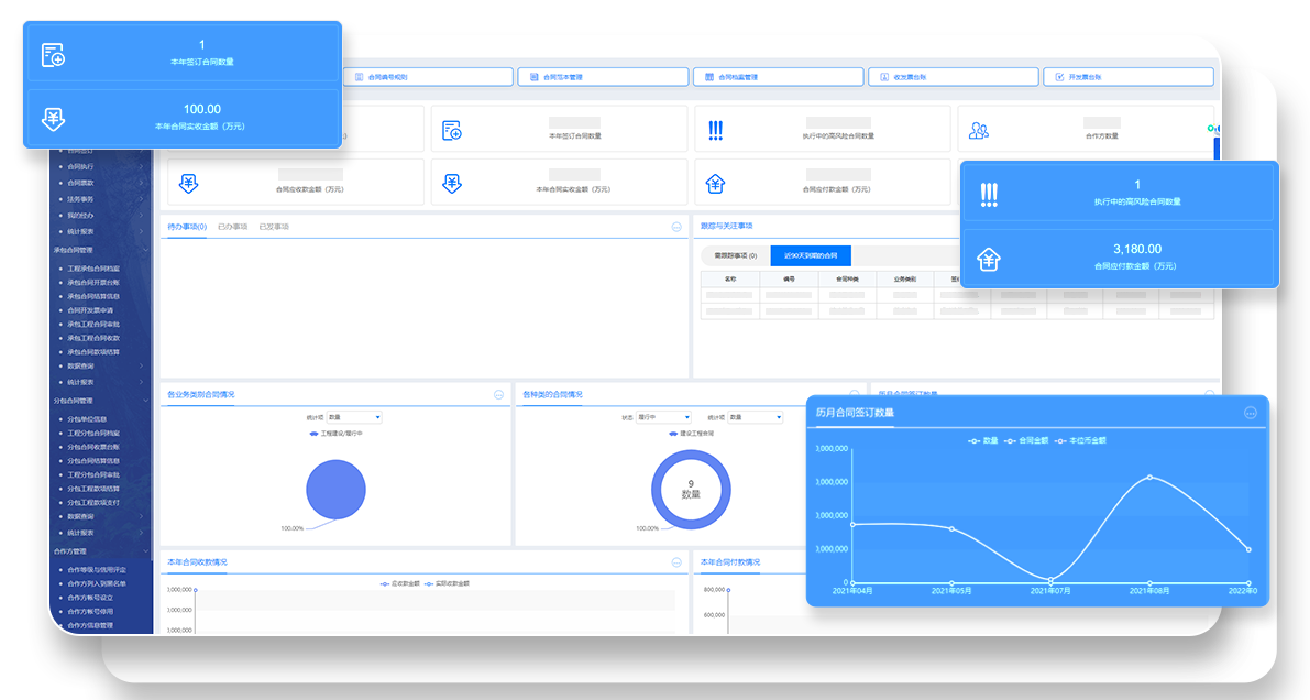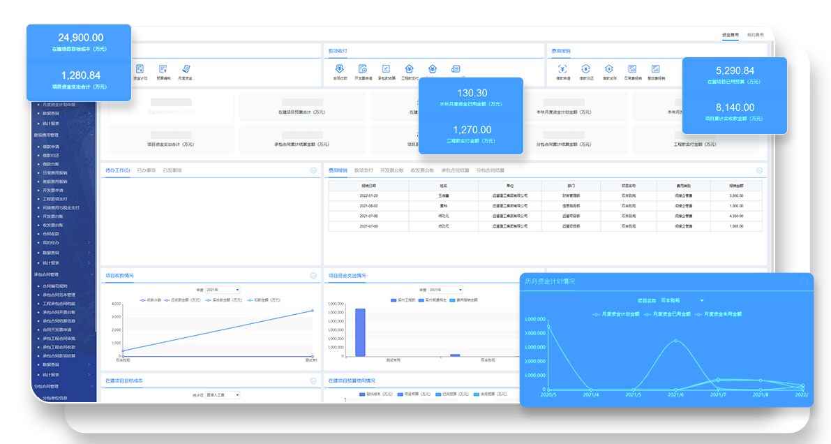 支撑项目成本、合同、过程、付款等核心要素的管控,灵活开展项目管理,有效把握成本测算、合同管控、过程核查、付款控制等重要环节,全局掌握项目运营,稳步推进项目落地。