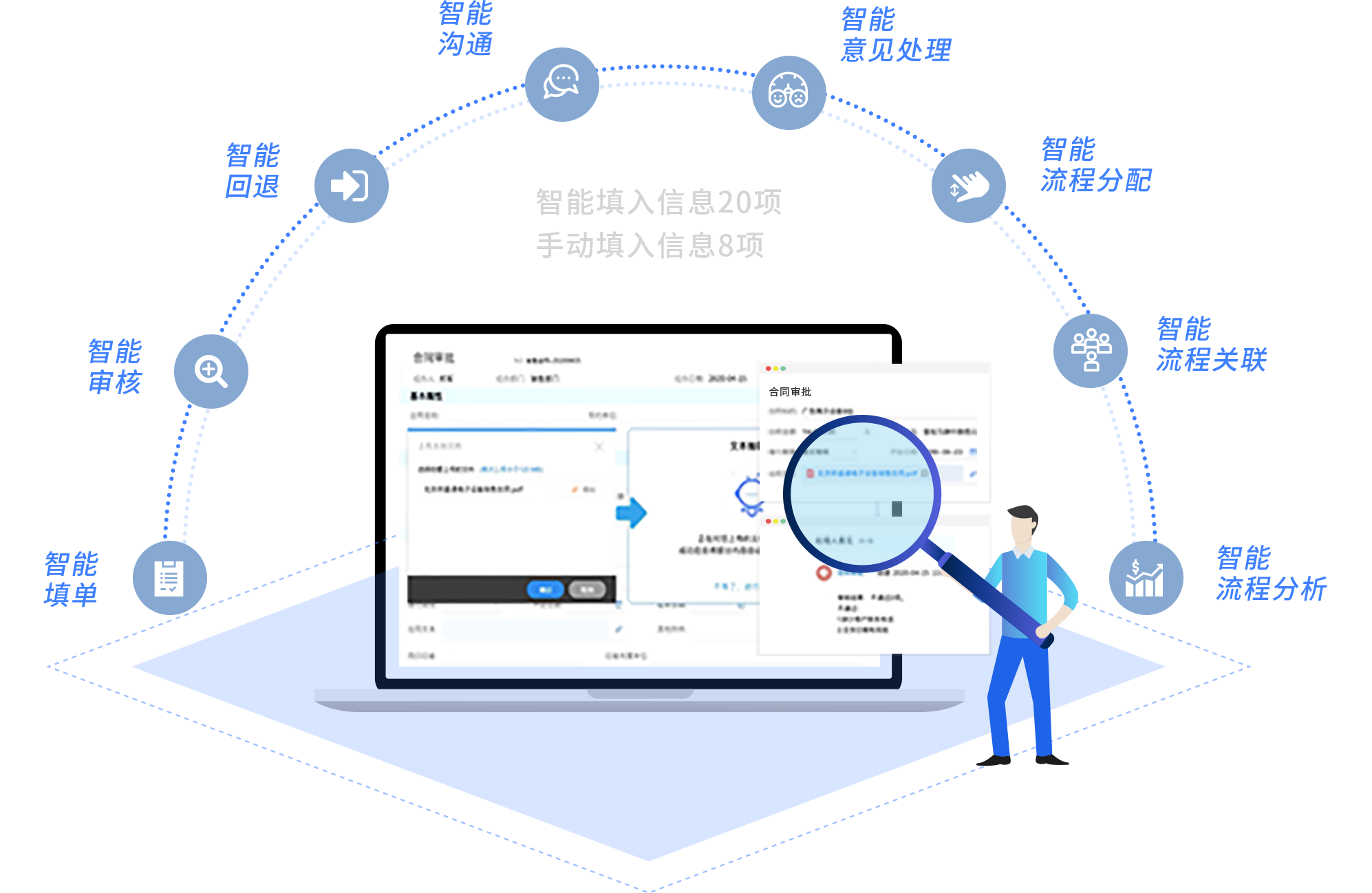 致远互联智能流程管理通过NLP文本抽取技术、流程智能化工具等实现智能填单、智能分配、智能审批、智能联动等业务全流程的智能化管理。如填单环节,系统自动完成从电子合同到协同单据的转换;审批环节AI智能流程机器人代替人工完成预审批,提升企业人工效率、业务处理效率,达到解放人力、提高企业整体效能的目标。