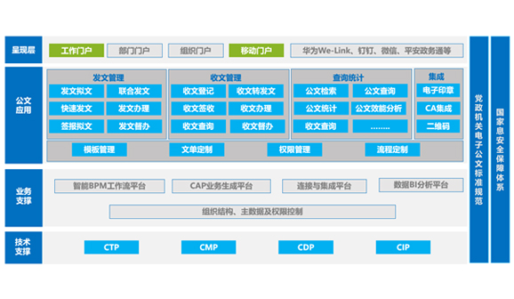 遵循国家规范的收发文、交换和文档管理一体化等制度,提供完备的电子公文管理功能,包括:公文应用设置、发文管理、收文管理、公文督办、公文查询、公文统计、公文档案等,还原政府办文实际场景,以电子化手段全面实现公文数字化流转。