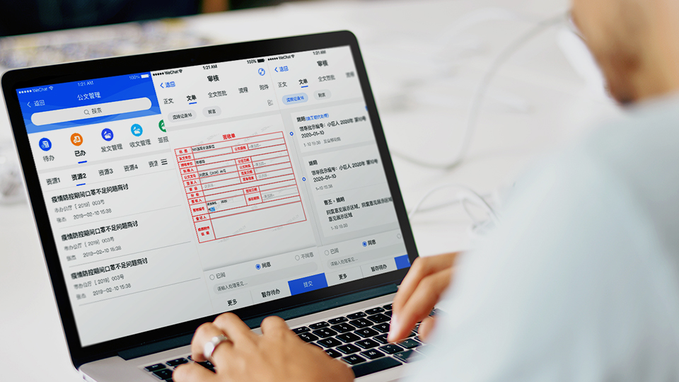 PC端与移动端相结合的办公模式,配置M1移动办公平台,涵盖公文、事务、会议、新闻等日常办公应用,不受空间、时间限制,随时随地移动办公,只需手写、点击、拖动等简单操作即可完成事务处理。