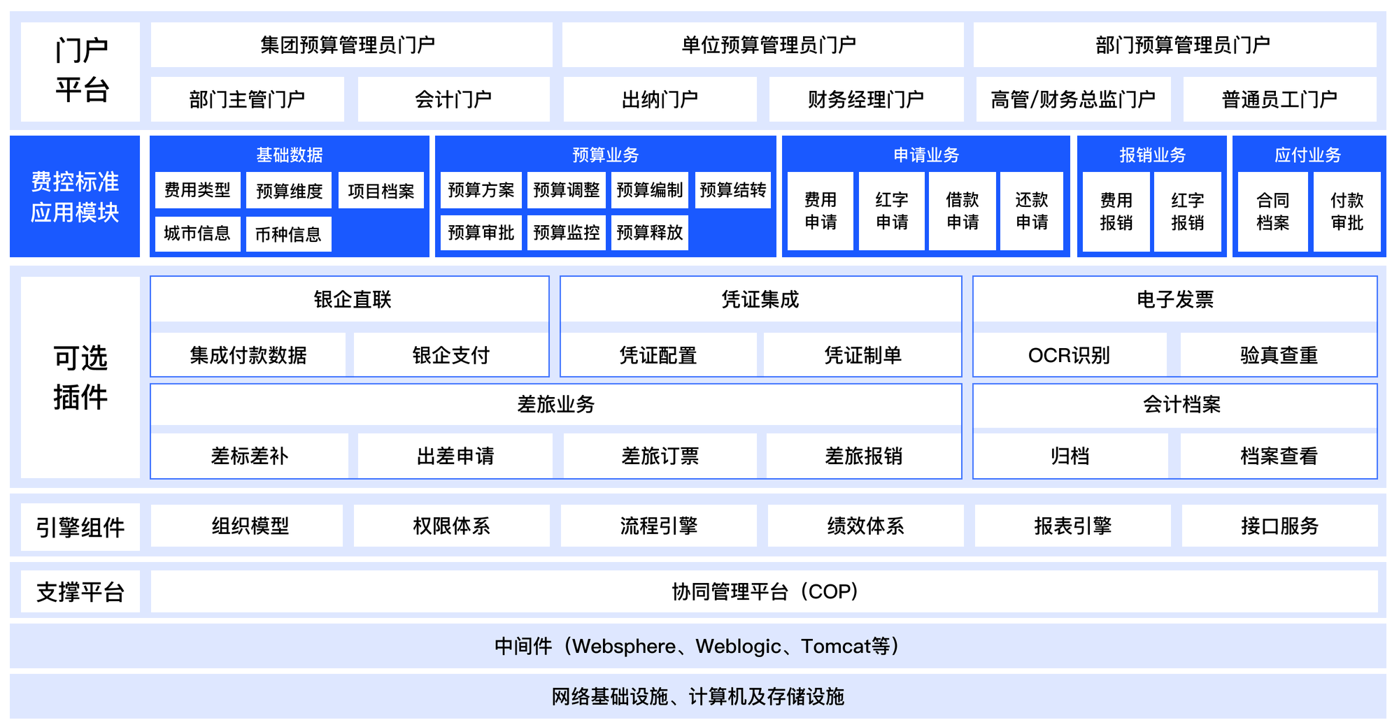 围绕“协同+业务+财务一体化”的设计理念,为企业的预算及费用管理提供全程电子化、一体化的费控管理解决方案