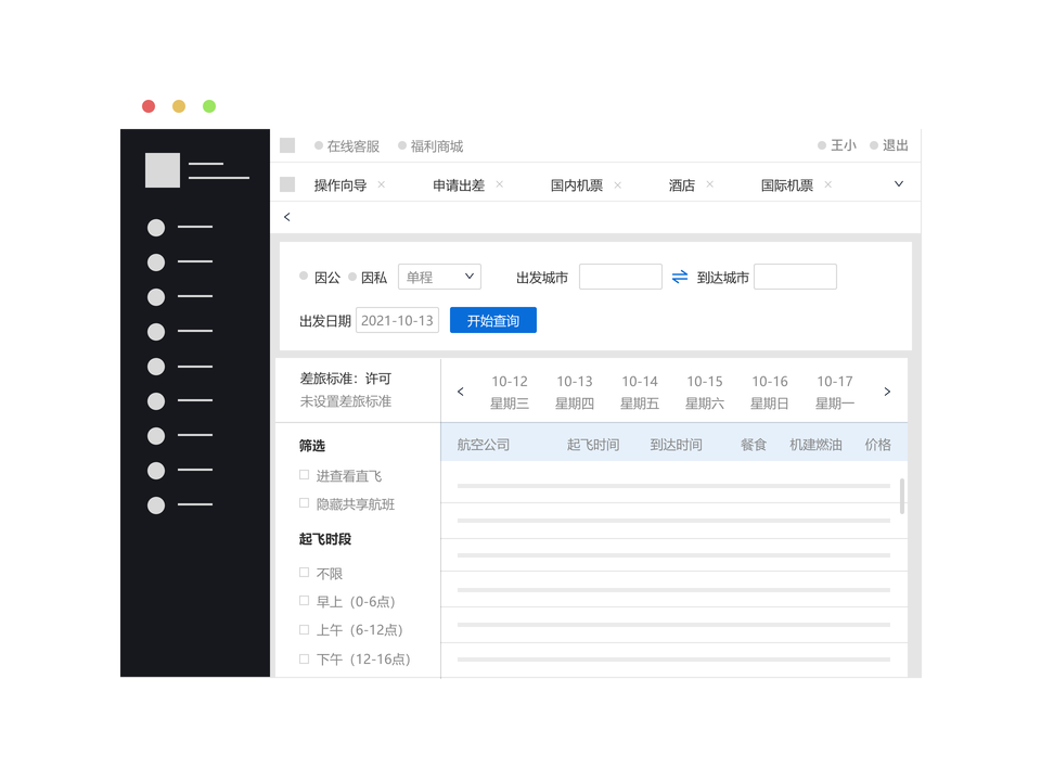 与差旅平台集成,员工可在查hi率申请通过后,一键进入差旅平台订票、订酒店,财务审批后由公司直接付款,无需垫付,便捷、省心。