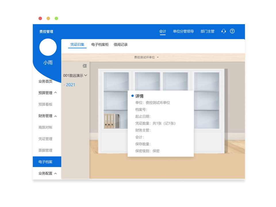 满足国家规范,会计档案自动归集。流程表单、电子发票、电子行程单、银行电子回单、财务凭证归集