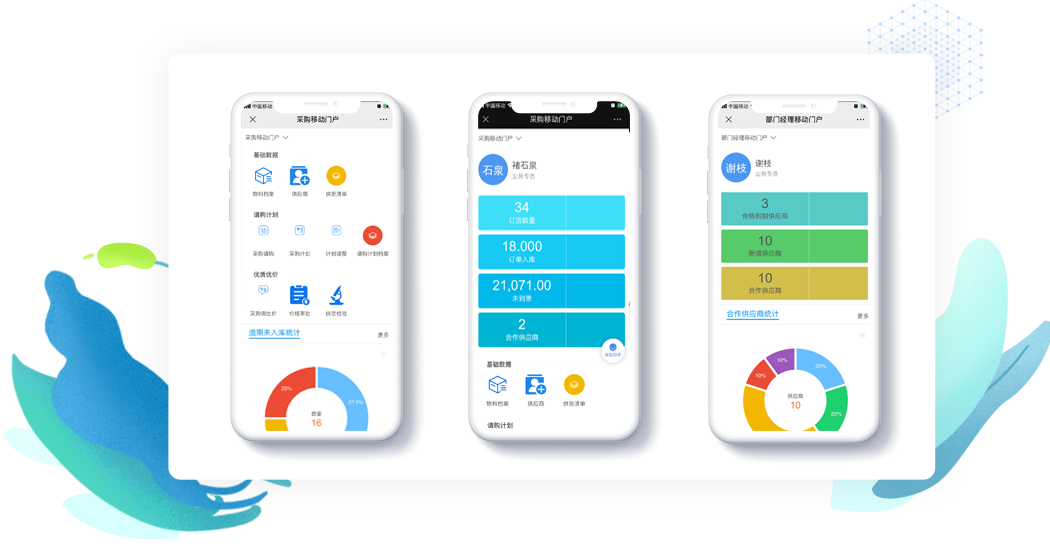 支持不同角色通过移动端或第三方入口(微信、钉钉等)进入采购管理应用,处理采购相关事宜,实现随时随地处理采购相关工作