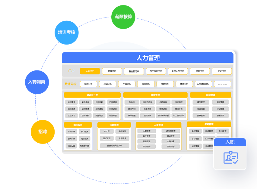 满足员工管理的全周期服务和全过程管理。从员工的招聘、入职、合同签订、异动,到薪资标准、考勤记录等,到考核、绩效等,行程员工管理和服务的闭环。