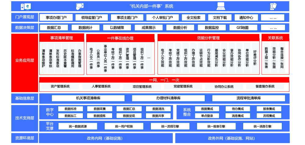 “一网协同”是服务政府公职人员,依托电子政务网实现政府工作运行“一张网”,办好“一件事”,数据“报一次”,打造高频事项“一件事”的一链应用、基层数据“最多报一次”和重点领域跨层级、跨地域、跨部门、跨系统、跨业务协同应用,形成全市各级机关核心业务全覆盖、横向纵向全贯通的全方位数字化协同工作体系。